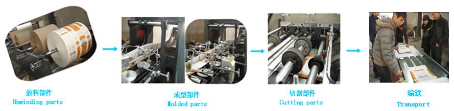卷料 → 過料 → 分層 →中上膠 →成型→多層牽引→ 切斷(定長短)→拉斷 → 光電計數(shù) → 整袋輸送 → 成品。